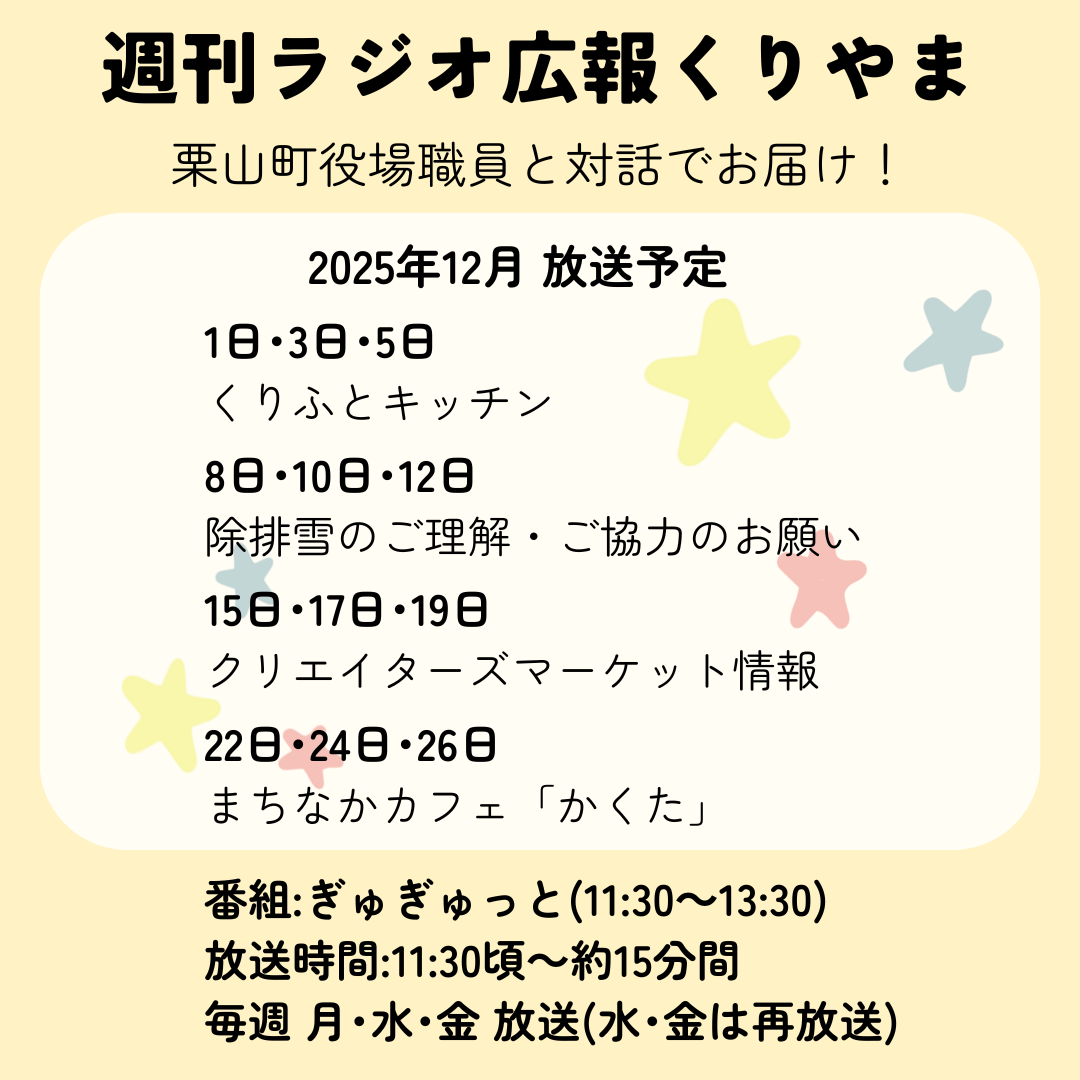 「ぎゅぎゅっと(11:30~13:30)」内で、栗山町役場からのお知らせ拡大版(15分版)として放送します。イベントや町事業のご案内、暮らしに関わる啓発など、パーソナリティと役場職員の対話方式でお届けします。週ごとにテーマが変わり、月曜日・水曜日・金曜日の週3回放送します。