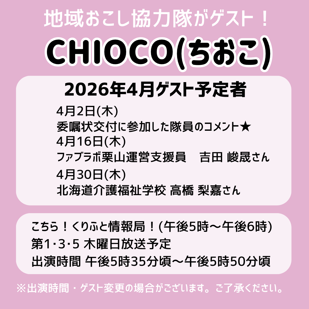 4月CHIOCO(ちおこ)ゲスト情報 2026年4月1日更新 エフエムくりやま お知らせ 栗山町地域おこし協力隊コーナー【CHIOCO(ちおこ)】 第1・3・5木曜日 こちら!くりふと情報局!午後5時35分頃~午後5時50分(約15分間予定)※生放送のため時間やゲストが変更する場合がございます。 お楽しみに!