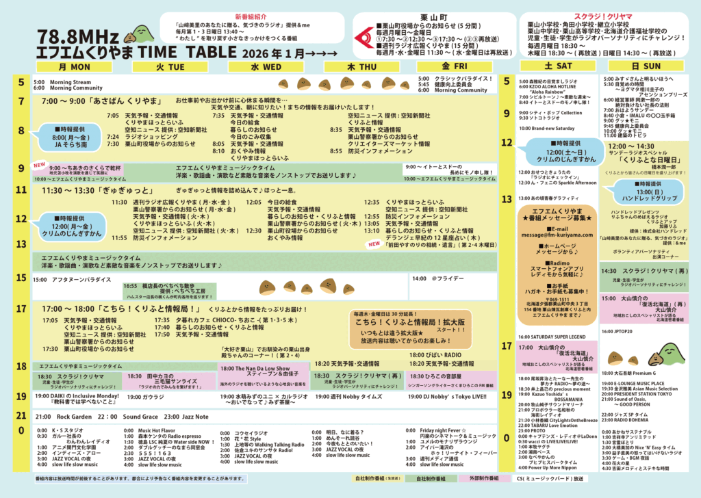 番組表 78.8MHz エフエムくりやまタイムテーブル 2026.1月▶▶▶ ※画像をクリックするとPDFファイル(約327KB)が開きます。 ※画像をクリックすると表紙・裏面のPDFファイル(約649KB)が開きます。